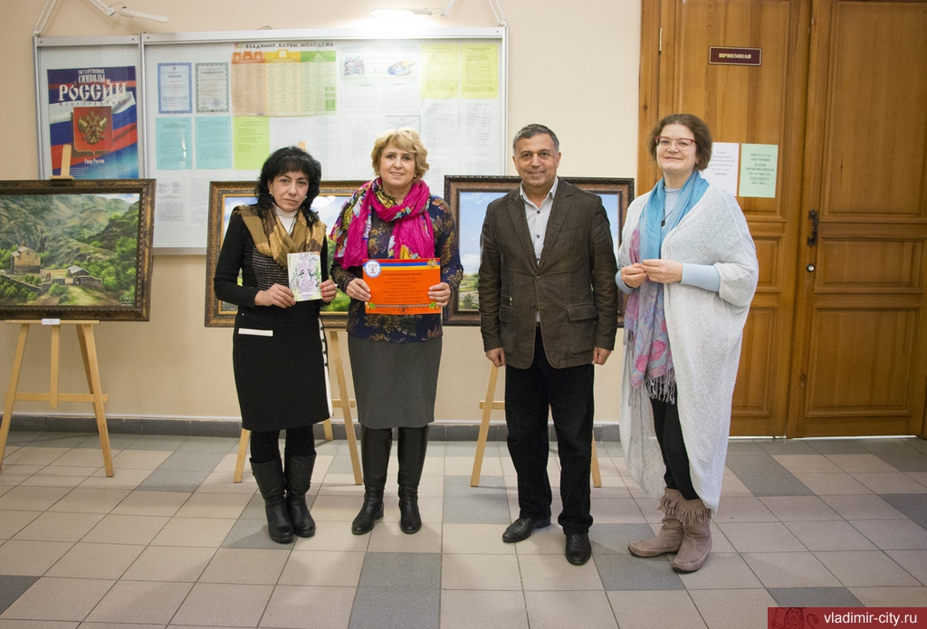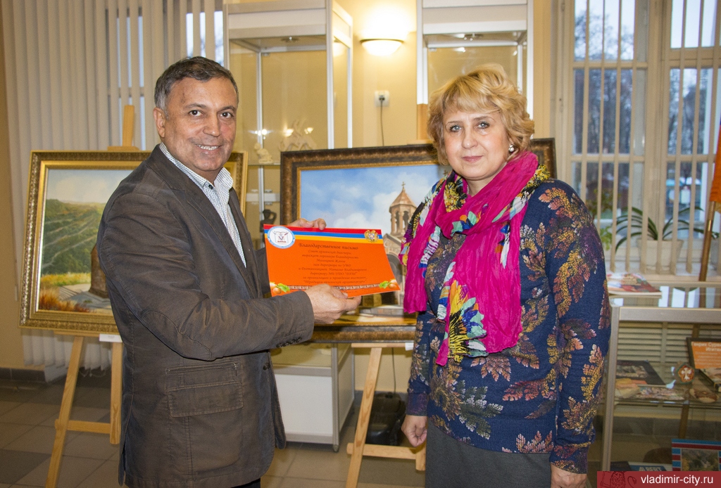 Руководитель городского отделения "Армянского национального союза" Сергей Яжан вручает Благодарственное письмо директору Художественной школы города Владимира Наталье Дегтянниковой