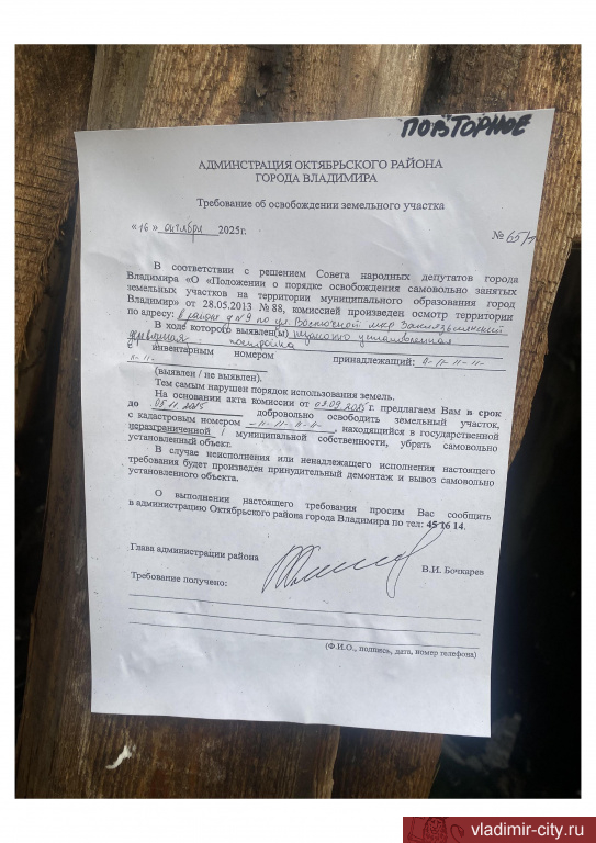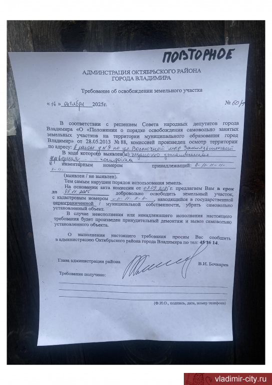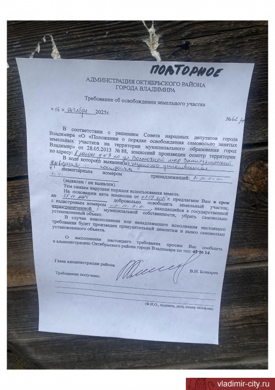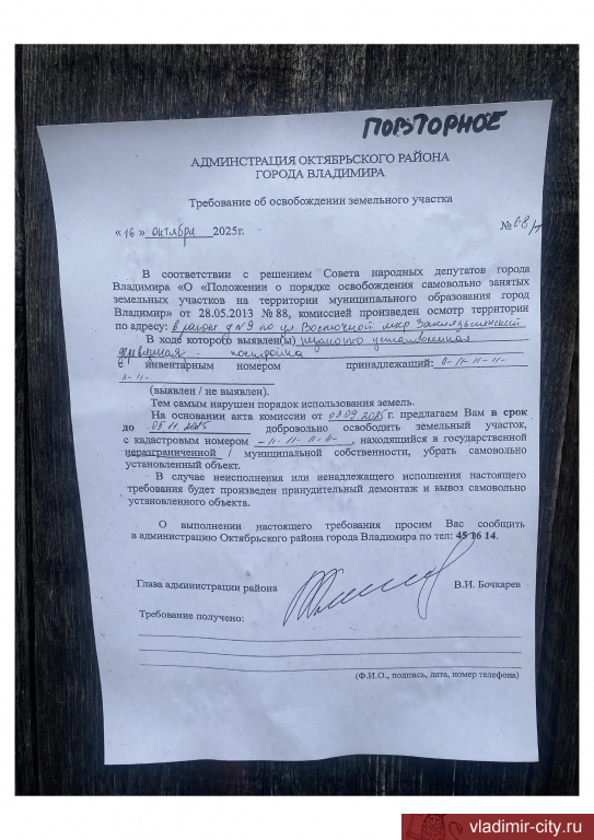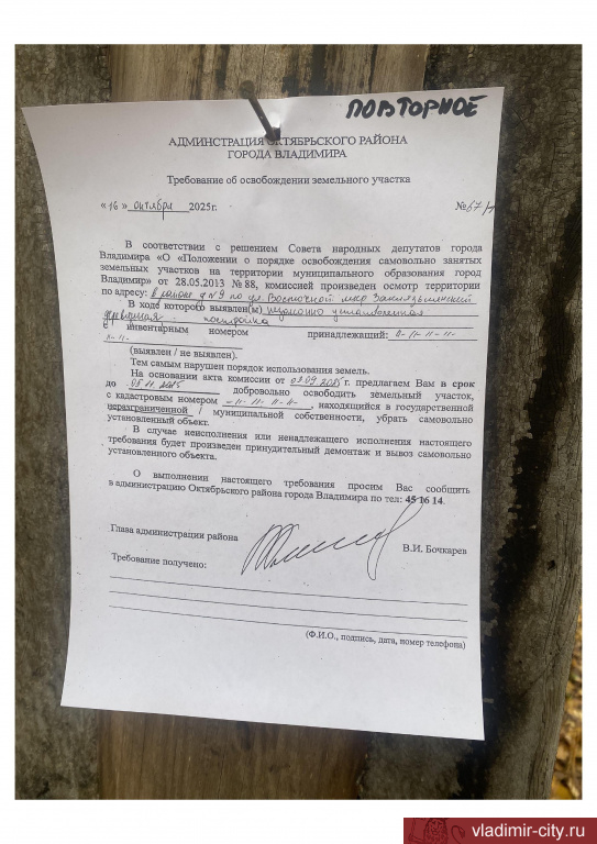 Администрация Октябрьского района города Владимира обращается к собственникам указанных объектов с требованием об освобождении земельного участка своими силами в течение 20 дней с даты публикации данного сообщения.